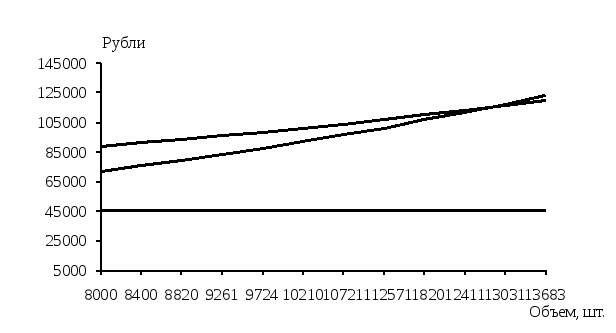 Зависимость общей суммы затрат от объема производства показана на рис. 8 и 9.