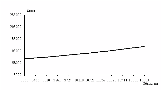 Рис. 10. Зависимость прибыли от объема производства, 2006 год