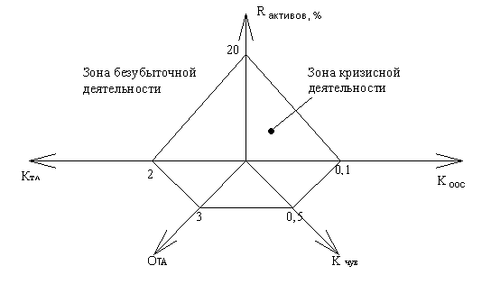 Рассчитав показатели n-мерной параметрической интерпретации финансового состояния предприятия и сравнив их с нормативами можно сделать вывод о том, что предприятие находится в зоне кризисной деятельности. Все коэффициенты не превышают нормативных значений.