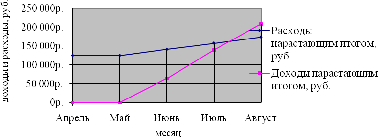 Доходы начинают покрывать расходы в начале августа, турфирма выходит на точку безубыточности, на конец августа валовый доход турфирмы «Виктория» составит 34 597,75 рублей.