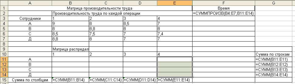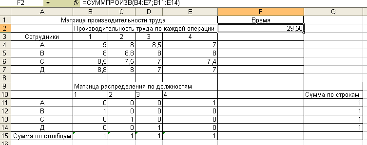 Вывод: С учетом производительности труда всех работников по каждой операции, менеджеру необходимо назначить: сотрудника A на должность № 4, сотрудника B на должность №1, сотрудника C на должность №2, сотрудника D на должность №3,. При этом коллектив добьется общей времени упаковки 29,50 мин.