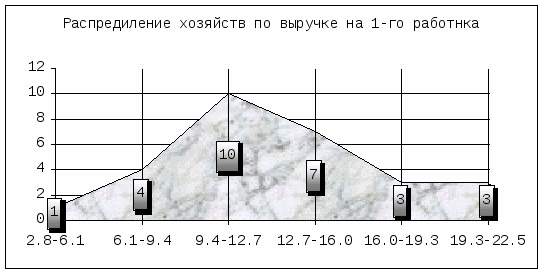 По данным гистограммы можно сделать вывод, что в большинстве хозяйств выручка на одного работника находится в интервале от 9,4 до 12,7 тысяч рублей, а в среднем 11,05 тыс. руб.