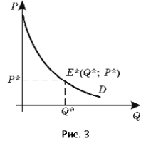 Перейдемо тепер до розгляду додатків інтегрального аналізу для визначення споживчого надлишку. Для цього зобразимо на графіку зворотну функцію попиту P = f(Q). Допустимо, що ринкова рівновага встановилася в точці E*(q*; p*) (крива пропозиції на графіку відсутній для зручності подальшого аналізу, малюнок 3).