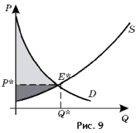 Ми розглянули, як визначаються надлишки споживача й виробника. Відзначимо, що сума цих двох надлишків - площа заштрихованої фігури на малюнку 9 - характеризує загальний ефект виробництва й споживання на розглянутому ринку.