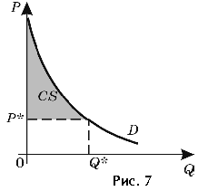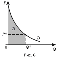 Згадавши, що кожна точка на кривій попиту Pі = f(Qі) (і = 1, 2, ..., k) показує, яку суму споживач готовий заплатити за покупку додаткової одиниці продукту, одержимо, що площа фігури B відповідає загальній грошовій сумі, що споживач готовий витратити на покупку Q* одиниць товару. Різниця між площею фігури B і площею прямокутника A є споживчий надлишок при покупці даного товару - перевищення загальної вартості, що споживач готовий сплатити за всі одиниці товару, над його реальними витратами на їхнє придбання [4] (площа заштрихованої фігури на малюнку 7).