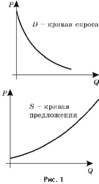Відзначимо, що економісти порахували зручним зображувати аргумент (ціну) по осі ординат, а залежна змінну (кількість товару) по осі абсцис. Тому графіки функцій попиту та пропозиції виглядають у такий спосіб (малюнок 1).