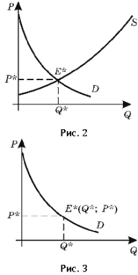 І, нарешті, уведемо ще одне поняття, що грає більшу роль у моделюванні економічних процесів - ринкова рівновага. Стан рівноваги характеризують такі ціна й кількість, при яких обсяг попиту збігається з величиною пропозиції, а графічно ринкова рівновага зображується точкою перетинання кривих попиту та пропозиції (малюнок 2), E*(p*; q*) - точка рівноваги.