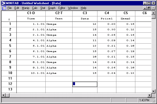 На рисунке 1 показано, какими могут быть названия колонок и какие существуют форматы представления данных в статистическом пакете MINITAB. MINITAB автоматически распознает соответствующие форматы данных и добавляет к нумерации колонки буквы, обозначающие тот или иной формат. Например, колонка С1 на рисунке 1 содержит данные формата даты/времени и поэтому к названию колонки добавляется буква "D" (C1-D), аналогично колонка С2 обозначается (С2-Т), т.к. она содержит текстовые данные.