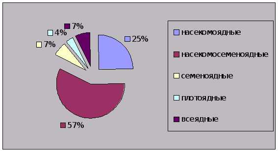 Значительную долю занимают птицы, гнездящиеся недоступно—кронники и дуплогнездники—59,2%. По характеру пребывания по экологическим комплексам в плодовых садах значительная доля опушечного комплекса—28,5%.