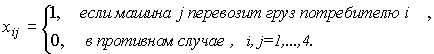 Здесь через x>ij> обозначен факт поставки i-му потребителю груза j-ой машиной, т.е.