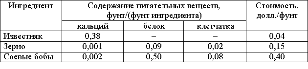 Для того чтобы цыплята достигли к восьмой неделе необходимых весовых кондиций, кормовой рацион должен удовлетворять определенным требованиям по питательности. Этим требованиям могут соответствовать смеси различных видов кормов, или ингредиентов. В качестве ингредиентов рассмотрим три: известняк, зерно и соевые бобы. Требования к питательности рациона сформулируем, учитывая три вида питательных веществ: кальций, белок и клетчатку. В таблице приведены данные, характеризующие содержание (по весу) питательных веществ в каждом из ингредиентов и удельную стоимость каждого ингредиента. Заметим, что известняк не содержит ни белка, ни клетчатки.