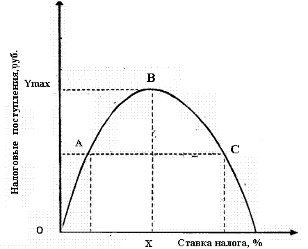 Американский экономист А. Лаффер исследовал взаимосвязь между величиной ставки налога и поступлениями в госбюджет средств от сбора налогов. Он установил следующую закономерность: повышение налоговой ставки обеспечивает большую величину налоговых поступлений лишь до определенного момента, а после него дальнейшее повышение ставки налога ведет к снижению стимулов производства и таким образом общая сумма налоговых поступлений от предприятий сокращается.