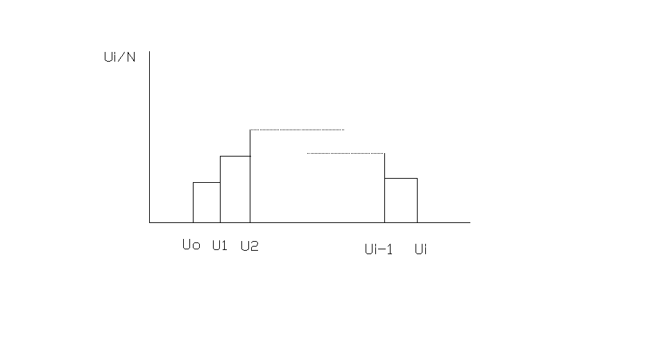 Для построения гистограммы диапазон возможных значений элементов последовательности разбивается на е участков точками U1,U2,Ue