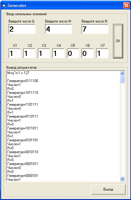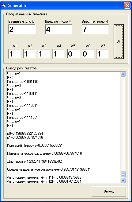 1. программная реализация базой псевдослучайной последовательности, вырабатываемой генератором случайных чисел при заданных преподавателем параметрах: g,n,m.