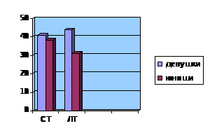 Различия между ЛТ тревожностью у юношей и девушек менее чем на 0,05 %. Гипотеза о равенстве H>0> отклоняется и принимается гипотеза о различии H>1>.