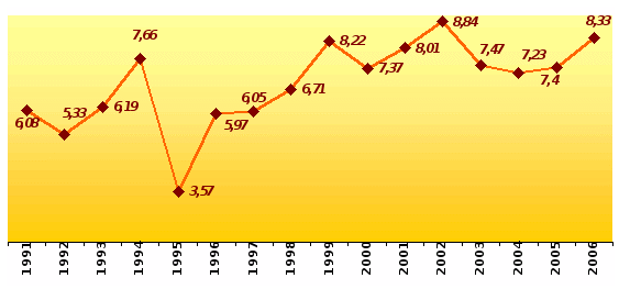 В 2006 г. коэффициент смертности по сравнению с уровнем предыдущего года снизился на 7,6 процентных пункта и составил 14,5 промилле.