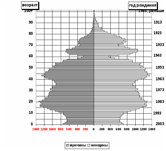 Построив половозрастную пирамиду, сразу можно увидеть молодое население (широкое основание пирамиды) или старое (пирамида сравнительно широка в возрастах старше 50 лет), каково соотношение численности мужчин и женщин в различных возрастах и, наконец, можно увидеть, так называемые, «провалы» (существенно меньшая численность населения по сравнению с соседними возрастными группами) и «выпуклости» (наоборот, существенно большая численность населения по сравнению с соседними возрастными группами) [32, с. 24].