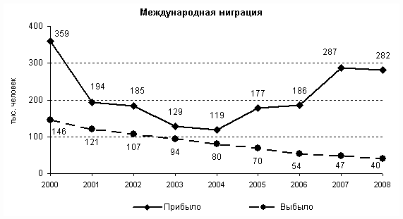 На учитываемые статистикой объемы международной миграции в большой степени сказываются изменения в законодательстве. В частности, резкое сокращение числа прибывших в 2001 г., по-видимому, объясняется введенными ограничениями приема граждан стран СНГ и Балтии. В последующие годы в статистический учет попадали все граждане России, прибывшие на постоянное жительство из-за пределов страны и иностранные граждане и лица без гражданства, получившие вид на жительство.