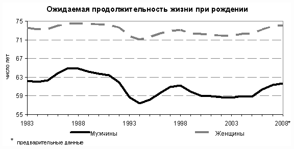 Вследствие снижения смертности населения показатель ожидаемой продолжительности жизни при рождении за 2006–2007 годы вырос у мужчин на 2,5 года, у женщин – на 1,5 лет. Несмотря на то, что сокращение числа умерших в 2008 году по сравнению с 2007 годом составило только 4,5 тыс. человек, ожидаемая продолжительность жизни по предварительной оценке возросла у мужчин до 61,7 лет, у женщин – до 74,2 лет (в 2007 г. – 61,4 и 73,9 соответственно). Это объясняется существенным снижением показателя младенческой смертности. В 2008 г. он составил 8,5 умерших детей в возрасте до 1 года на 1000 родившихся живыми (в 2007 г. – 9,4).