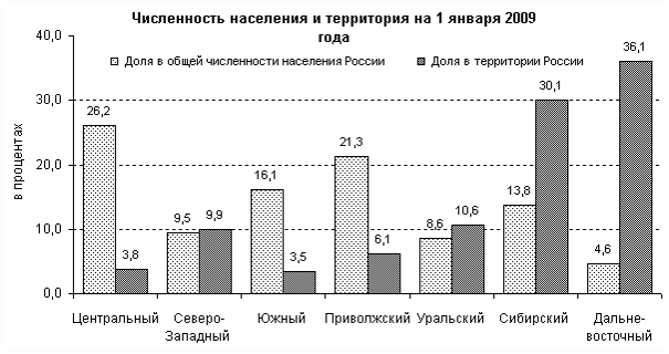 Изменения численности населения в 2008 г. практически не повлияли на структуру расселения. Более 40% россиян проживают в Центральном и Южном федеральных округах, где плотность населения наибольшая и составляет соответственно 57 и 39 человек на 1 кв. км. (в среднем по России плотность населения – 8,3 человека на 1 кв. км.). Самыми малонаселенными к 1 января 2008 г. были Республика Саха (Якутия), Камчатский край, Магаданская область, Ненецкий, Чукотский и Ямало-Ненецкий автономные округа, где плотность населения составляла менее 1 человека на 1 кв. км.