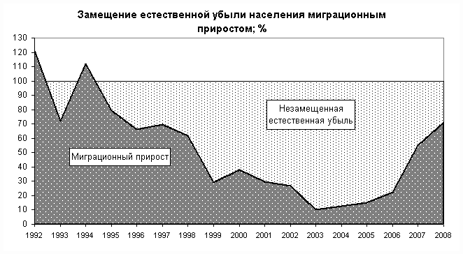 Вклад миграционного компонента в рост численности населения неуклонно уменьшался практически до 2003 года. Увеличение миграционного прироста в последующие годы при сокращении естественной убыли привели к замедлению темпов сокращения численности населения. В 2008 г. естественная убыль была на 71,0% замещена миграционным приростом (в 2007 г. – на 54,9%, в 2006 г. – на 22,5%).