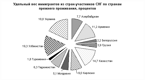 Среди всех иммигрантов в 2008 г. около 96% (270,0 тыс. человек) составляли бывшие жители стран-участников СНГ, из них почти 50% – выходцы из Узбекистана, Украины и Казахстана (соответственно 43,5 тыс. человек, 49,1 тыс. и 40,0 тыс. человек).