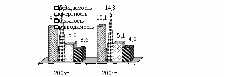 Сравнительные показатели демографических характеристик населения края за январь-июнь 2005г. и 2004г. (в расчете на 1000 человек):