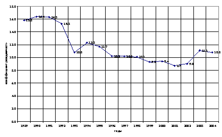 С 1989г. по 1991г. коэффициент брачности в стране вырос на 1,2. В 1992г. он упал в связи с нестабильной политикой. До 2000г. наблюдается плавный спад, но к 2001г. он вырос и продолжал расти до 2003г. 4