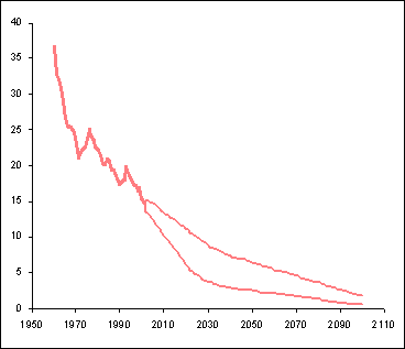 Противоположным примером прогноза-предупреждения являются расчеты В.Н. Архангельского и А.Б. Синельникова. Их расчет основан на простом сопоставлении актуальной (текущей) величины суммарного коэффициента рождаемости и того его значения, которое необходимо для поддержания хотя бы простого воспроизводства населения.