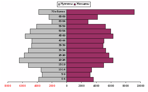 Основную долю населения составляет население в трудоспособном возрасте. Численность населения в возрасте моложе трудоспособного в 1996 г. превышала численность населения в возрасте старше трудоспособного. Однако в 2001 г. уже наблюдается обратная картина: превышение численности населения в возрасте старше трудоспособного. Причем в 2004-2006 гг. это превышение становится все более заметным.