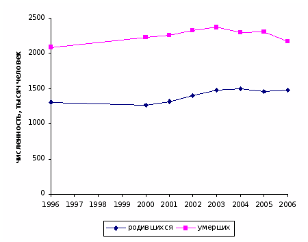 В течение всего рассматриваемого периода численность умерших в РФ значительно превышала численность родившихся, вследствие чего имеет место естественная убыль населения. В 2006 г. наметилась тенденция к сокращению числа умерших и росту числа родившихся. Естественная убыль минимальна в 2006 г.