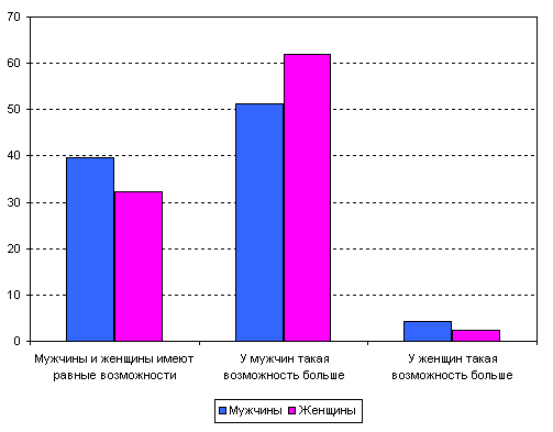 Помимо проблем, связанных с гендерной сегрегацией, на положение женщин на рынке труда оказывает влияние и дискриминация со стороны работодателя. Многочисленные исследования оценок гендерной дискриминации и со стороны работников, и со стороны работодателей показывают, что наиболее актуальным видом дискриминации на российском рынке труда является дискриминация при найме и увольнении. Так большинство и женщин, и мужчин разделяли позицию, что мужчины имеют лучшие шансы при трудоустройстве (диаграмма №2).