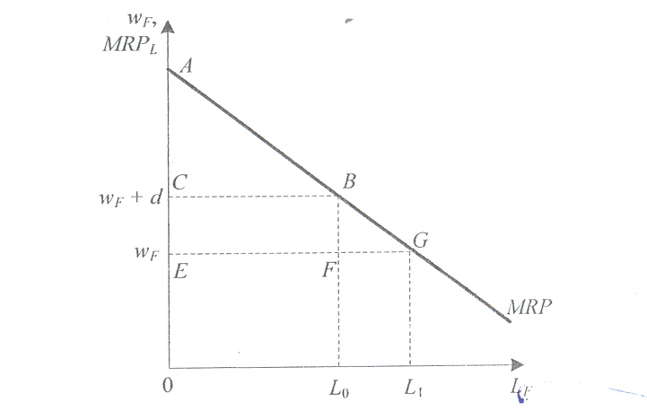 Дискриминирующий наниматель при уровне заработной платы женщин w>F>> >наймёт их в количестве L>0>, поскольку при этом MRP= w>F>+ d. Работодатель, у которого отсутствует предубеждение (d=0), порождающее дискриминацию, наймёт больше женщин, L>1>, поскольку он максимизирует прибыль MRP= w>F>>.>
