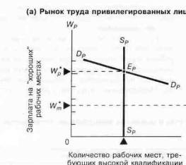 Предложение привилегированных работников на этом рынке труда показано кривой SpSp, а спрос на этот труд демонстрирует кривая DpDp. Равновесная ставка зарплаты достигается на высоком уровне, отмеченном точкой Ер.