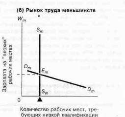 Между тем, на рис. 1 (6) показано, как обстоят дела в секторе с низкооплачиваемыми услугами или на неквалифицированной работе. Меньшинства живут в областях с бедными школами и не имеют возможности получить образование частным образом, поэтому они не приобретают знаний и умений, необходимых для высокооплачиваемой работы. Не обладая достаточной подготовкой, они имеют низкую предельную выручку фактора, занимаясь трудом, не требующим высокой квалификации, и, таким образом, их уровень зарплаты характеризуется точкой равновесия Em.