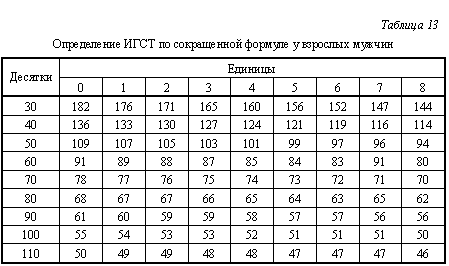 где t - время выполнения теста, в сек., f1 - частота пульса за 30 сек. на 2-й минуте восстановительного периода. При большом числе обследуемых для определения ИГСТ можно использовать табл. 12, 13, для чего в вертикальном столбце (десятки) находят сумму трех подсчетов пульса (f1 + f2 + f3) в десятках, в верхней горизонтальной строке - последнюю цифру суммы и в месте пересечения - значение ИГСТ. Затем по нормативам (оценочным таблицам) оценивается физическая работоспособность (табл. 14). Рекомендации к работе. Вычислить ИГСТ по формуле и таблице. Сравнить ее с рекомендуемыми величинами.