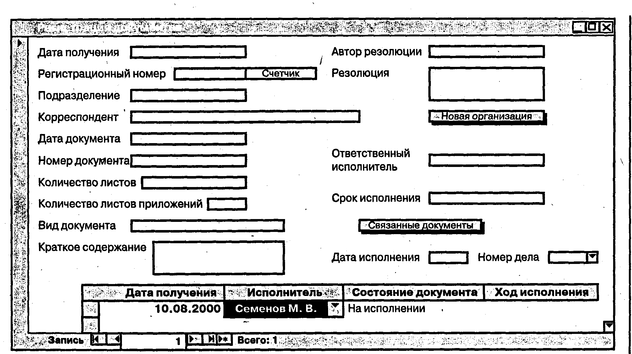 Выводимые на экран компьютера регистрационные формы входящих, исходящих и внутренних документов имеют незначительные отличия. Примерная форма регистрационной карточки для входящих документов приведена на рис 14.