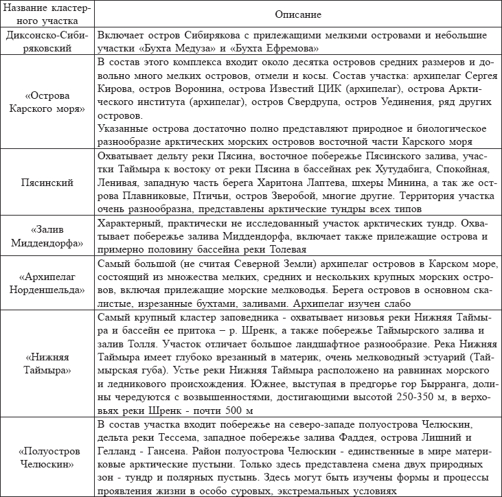 Территория заповедника представляет собой эталонные участки земной поверхности, на которых представлены почти все природные зоны Таймыра: арктические ("Арктический филиал"), типичные ("Основная территория"), южные (участок "Ары-Мас") тундры и лесотундра (участок "Лукунский"), а также уникальные горные тундры хр. Бырранга (табл.1).