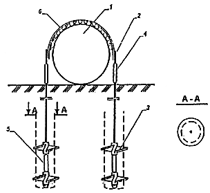 Буровые анкеры могут быть применены в разнообразных грунтовых условиях, в том числе при неоднородном напластовании грунтов с прослойками твердых включений. Буровые анкеры выполняют во всех типах грунтов, причем анкеры с камуфлетным уширением рекомендуется применять в. грунтах, способных уплотняться при взрыве, анкеры с разбуренным уширением в песчаных грунтах, инъекционные — в гравелистых, песчаных и трещиноватых скальных породах. В песчаных грунтах инъекционные анкеры устраивают следующим образом. После забуривания скважины в нее опускают стержень или проволоку, на которых закреплен резиновый уплотнитель, отделяющий анкерную зону длиной от 4 до 6 м от остальной части скважины. Закрепление трубопроводов инъекционными анкерными устройствами осуществляют на болотах с глубиной, равной или меньшей глубины траншеи, с подстилающими минеральными грунтами, обеспечивающими надежную работу анкеров, а также на пойменных и периодически обводняемых участках.