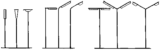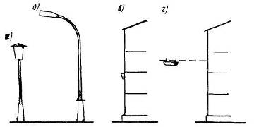 Опоры для уличных светильников изготовляют из стали, алюминия, железобетона, дерева. Деревянные опоры применяют только в поселках, на небольших улицах. Стальные опоры также не имеют распространения из-за дефицитности стали и большого веса. В некоторых странах получили распространение алюминиевые опоры. Фонарь уличного освещения представляет собой совокупность опоры, кронштейнов и светильников. Различают фонари венчающего и консольного типов, отличающиеся способом крепления светильников (рис. 2).