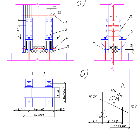Рис. 7. Узел соединения колонны с фундаментом: а – конструкция узла; б – расчетная схема; 1 – фундаментные болты; 2 – траверсы; 3 – болты; 4 – вклеенные стержни; 5 – эпоксидная шпаклевка