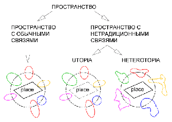 Это утопии и гетеротопии. Утопии - это местоположения без реального места, поддерживающие с реальными пространствами отношения прямой или обратной аналогии (например, идеальный город, общество). Гетеротопии - это, наоборот, места вполне реальные, которые, однако, являются местами без места - контр-местоположениями; они представляют, опровергают, переворачивают все другие местоположения, являются своего рода реализованными утопиями; это своего рода мифическое и реальное оспаривание конкретного места. (рис.1)