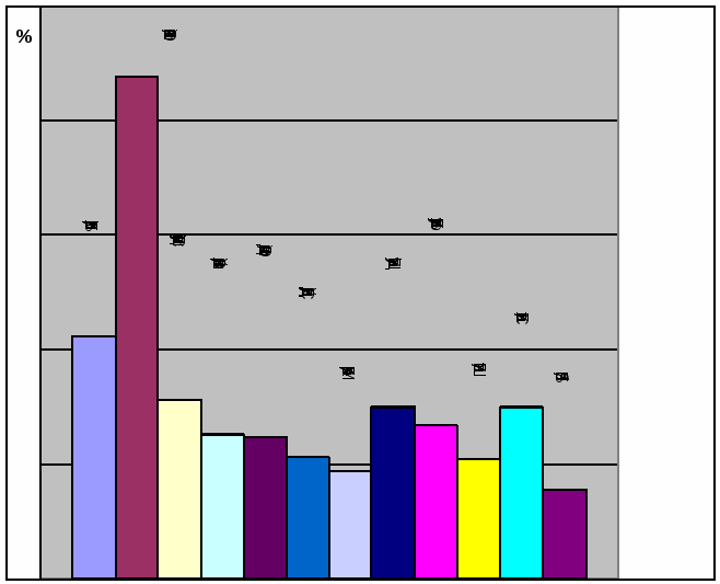 Рис. 1.1. Питома частка країн лідерів у загальному обсязі споживання замороженої плодоовочевої продукції, %.