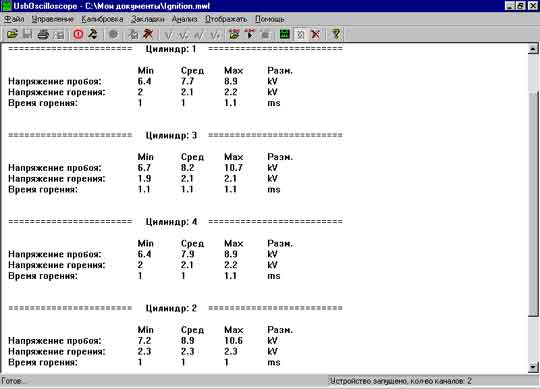 А. Напруга по всіх циліндрах рівномірно й дорівнює 40-45 кВ (15 мм). Справна система запалювання.