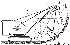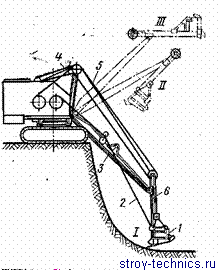 Обратная лопата (рис. 3) состоит из ковша, стрелы, рукояти и двуногой стойки. Ковш закреплен жестко к рукояти, шарнирно присоединенной к верхнему концу стрелы. При подтягивании каната рукоять поворачивается против часовой стрелки, ковш врезается в грунт (положение /; положения // и /// соответствуют транспортному положению и выгрузке грунта из ковша).