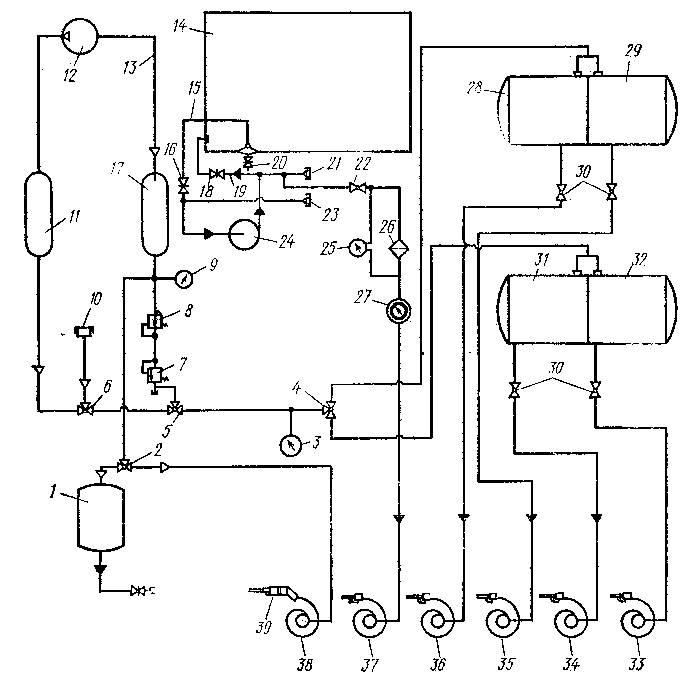 1 бункер для солидола, 2, 4, 5, 6 — трехходовой воздушный распределительный кран, 3 — мановакуумметр, 7 — предохранительный клапан, 8 — воздушный редуктор, 9 — манометр высокого давления, 10 — воздушный фильтр, 11 — ресивер всасывания, 12 — компрессор, 13 — нагнетательный воздушный трубопровод, 14 — цистерна дизельного топлива, 15 — трубопровод всасывающий, 16 — задвижка всасывающего трубопровода, 17 — ресивер нагнетания, 18 — задвижка нагнетательного трубопровода, 19 — нагнетательный трубопровод, 20 — отстойник с краном слива отстоя, 21 — трубопровод выдачи дизельного "топлива, 22 — кран, 23 — трубопровод для забора дизельного топлива, 24 — насос для дизельного топлива, 25 — дифманометр, 26 — фильтр тонкой очистки, 27 — счетчик дизельного топлива, 28 — бак для воды, 29 — бак для бензина, 30 — кран, 31 — бак для дизельного масла, 32 — бак для автотракторного масла, 33—37 — барабаны с самонаматывающимися рукавами и раздаточными кранами, 38 —. барабан с самонаматывающимся воздушным рукавом, 39 -г- пистолет-солидолонагнетатель