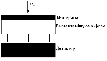 Необоротні оптроди через витрату РВФ мають обмежений термін служби. Однак його можна продовжити заміною РСФ на нову фазу. Стабільний сигнал від цих ВОС може бути отриманий лише в умовах стаціонарного масопереноса визначаємого компонента в зону його взаємодії з РВФ. Будь-яка перешкода, що порушує масоперенос, дає помилку в показаннях ВОС. На рис.3.3 показана схема роботи необоротного оптрода на кисень.