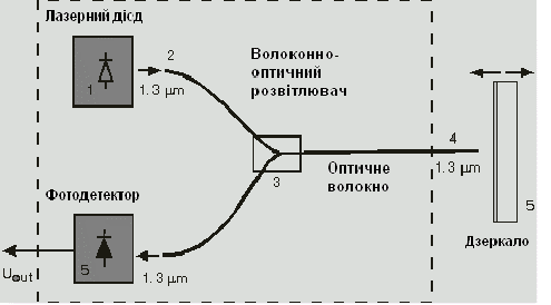 Випромінювання лазерного діода 1 вводиться у волоконний світловод 2 і через розвітлювач 3 передається на волокно 4. При цьому частина випромінювання відбивається від торця волоконного світловода 4, а інша його частина висвічується в повітря, відбивається від дзеркала 5 і повертається назад у волоконний світловод 4. Промінь, відбитий від торця волоконного світловода, інтерферує із променем, відбитим від дзеркала, і на фотоприймачі 5 реєструється інтенсивність випромінювання, що змінюється періодично в залежності від відстані x>0> між торцем світловода і дзеркалом: