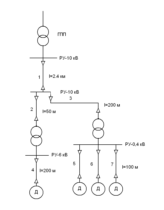 В задание говорится, что завод является потребителем первой категории. Из этого следует, что питание будет производится по двум линиям электропередач, от ГПП, где установлены два трансформатора, экономически целесообразно использовать кабельные линии проложенные в земле, так как расстояние от ГПП до распределительной подстанции меньше 10 километров. Каждый трансформатор подключен к отдельной линии, это связано с тем, что при аварии на первой линии работа будет продолжатся, так как вторая возьмет на себя всю нагрузку.