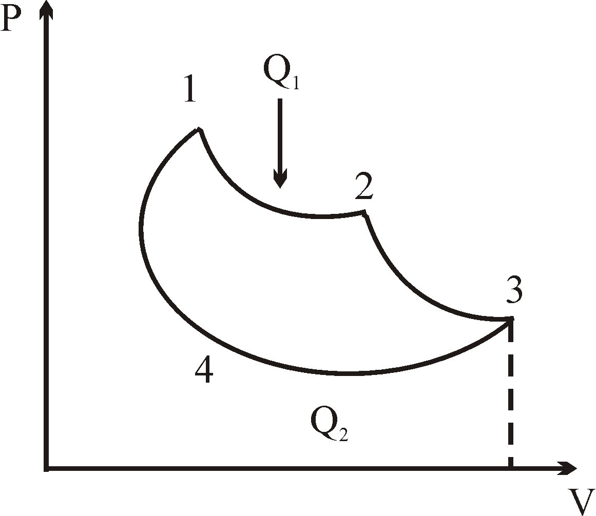 У процесі адіабатичного стискання /ділянка 4–1/ робота витрачається на підвищення внутрішньої енергії. Таким чином, газ повертається в свій початковий стан, до початкового значення внутрішньої енергії. Після виконання циклу в роботу перетворено / Q>1 >–Q>2 >/ теплоти, якщо Q>1 >і Q>2> виразити через роботу в ізотермічному процесі, то одержимо ККД цього циклу: